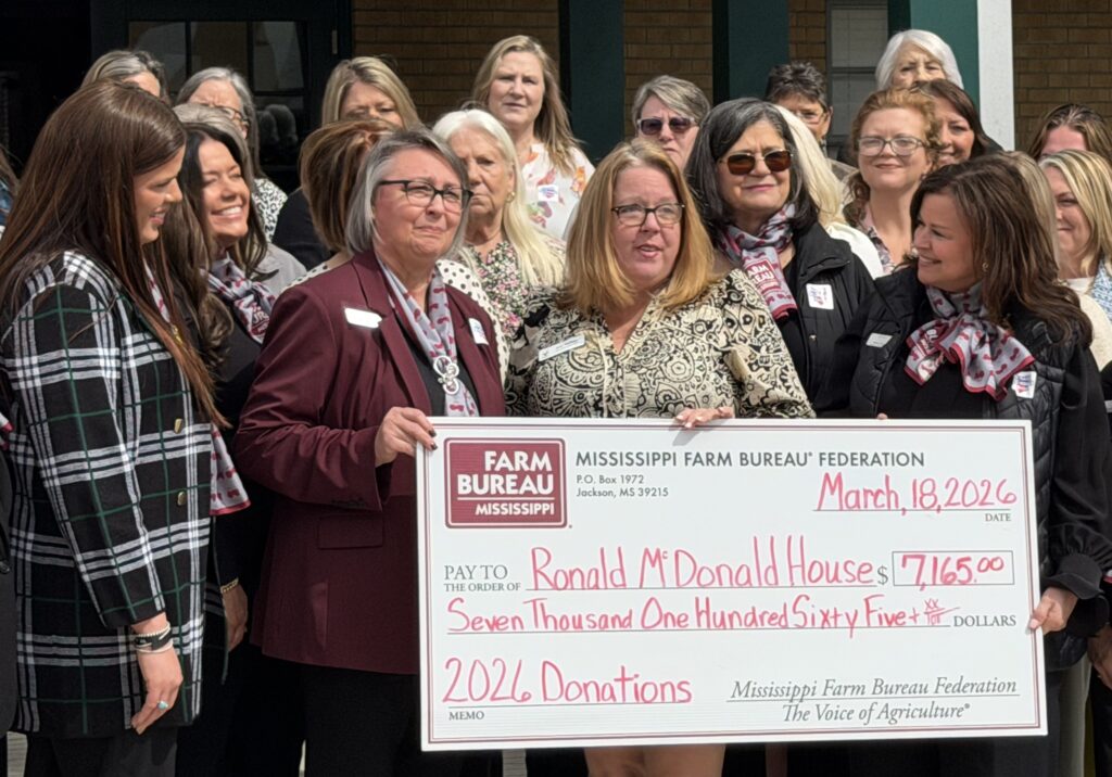 The annual donation was presented at the Ronald McDonald House on the campus of the University of Mississippi Medical Center, where families from across the state stay while their children receive critical medical care. The supplies—collected by County Farm Bureau offices, local businesses, schools, and community partners—included household items, food, and other essentials that help provide comfort to families during some of their most difficult moments.